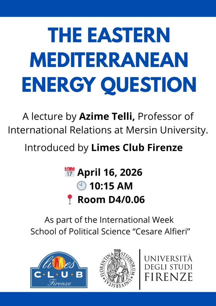 Il nostro prossimo incontro con Azime Telli, esperta di geopolitica dell’energia, dedicato a uno dei temi più rilevanti della politica internazionale contemporanea: the Eastern Mediterranean Energy Question (La questione energetica del Mediterraneo orientale).